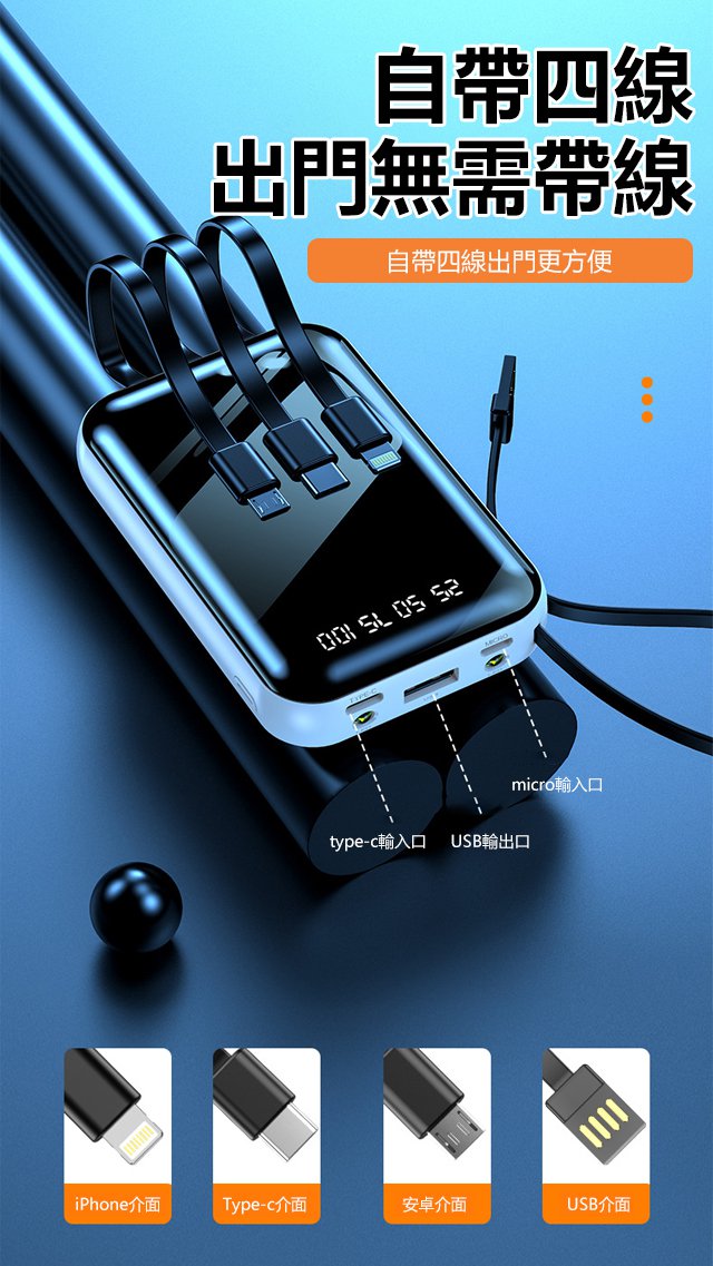 半小時前自帶四線的20000mAh快充充電寶,出門被各種要鏈接,20000M超大容量迷你充電寶,自帶4根手機快充線,各類手機都是可以使用 - 一組入NT$1198